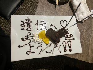 無事、面白く?自己紹介が終わり、会も終盤になってきた頃「遺伝へようこそ」と書かれたケーキが運ばれてきました。